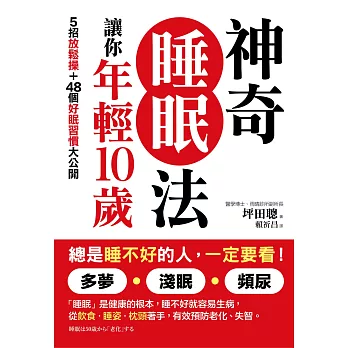 總是睡不好的人,一定要看! 神奇睡眠法,讓你年輕10歲:5招放鬆操+48個好眠習慣大公開,改善多夢-淺眠-頻尿推廌強打曾在博客來 網路書店造成搶購熱潮。