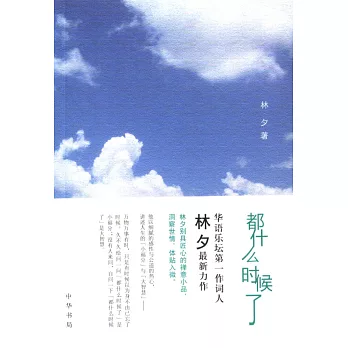 內容簡介: 博客來網路書店 主要講述了,「都什麽時候了?」世界紛繁,人事繚繞,時日飛馳,當滿眼朦朧滿心疲倦或滿眼朦朧滿心疲倦而不知的時候,這句問話也許真的是一記救人救心的晨鍾暮鼓;也許,每個人都應該在內心里追問和諦聽。所以,林夕說:「萬物萬事有時,只是有時候以為身不由己忘了時候。久不久給問一問『都什麽時候了』是小福分;沒有人來問,自問一下『都什麽時候了』是大智慧。」